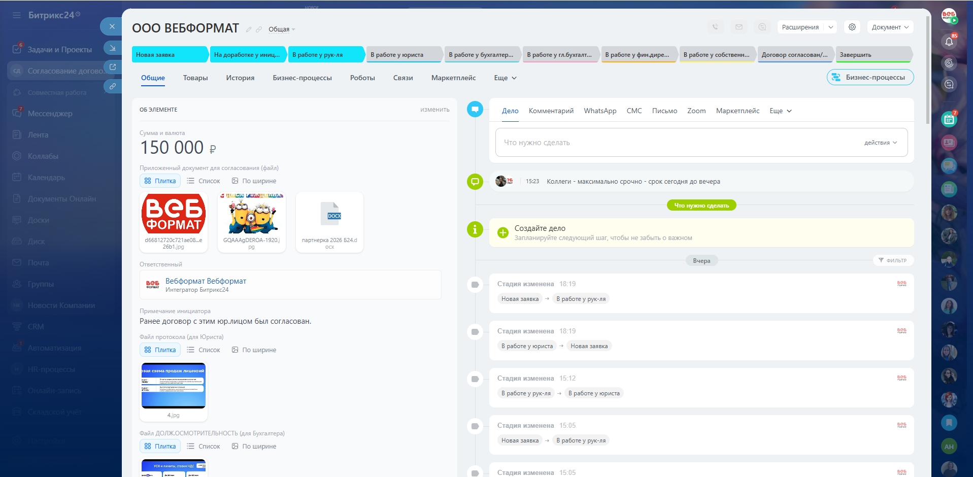 Создать прозрачный, управляемый и полностью цифровой процесс согласования договоров между сотрудниками компании и контрагентами внутри Битрикс24, с фиксацией решений и уведомлениями на каждом этапе.