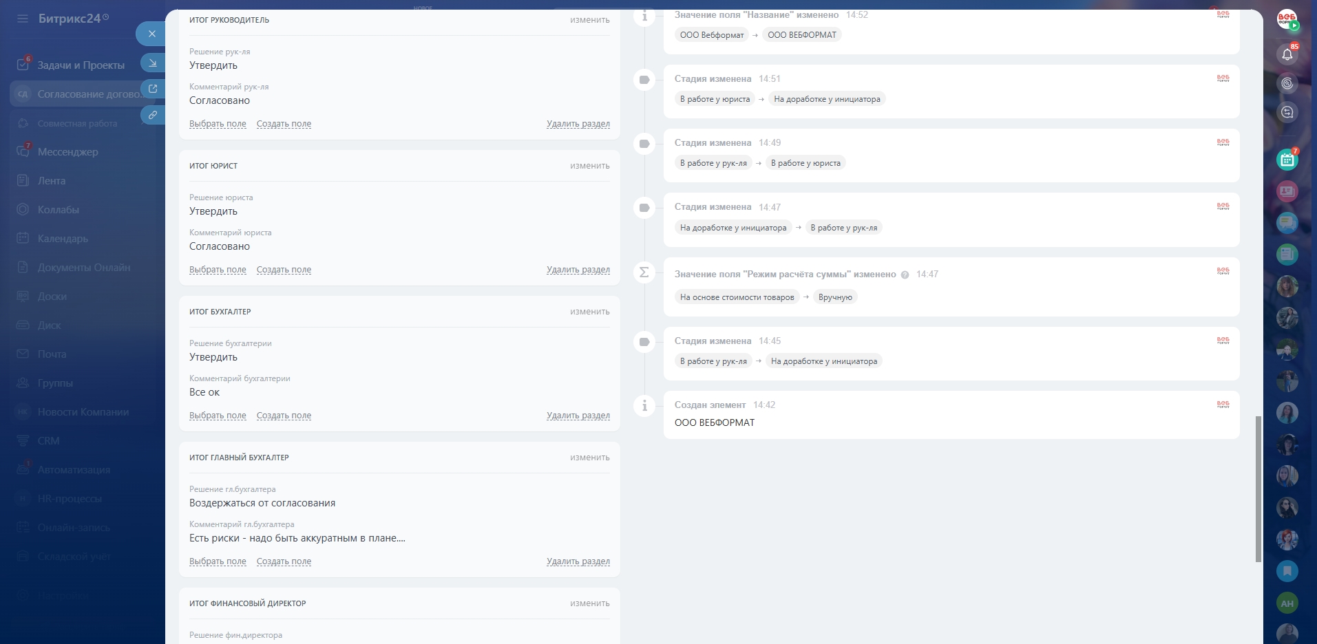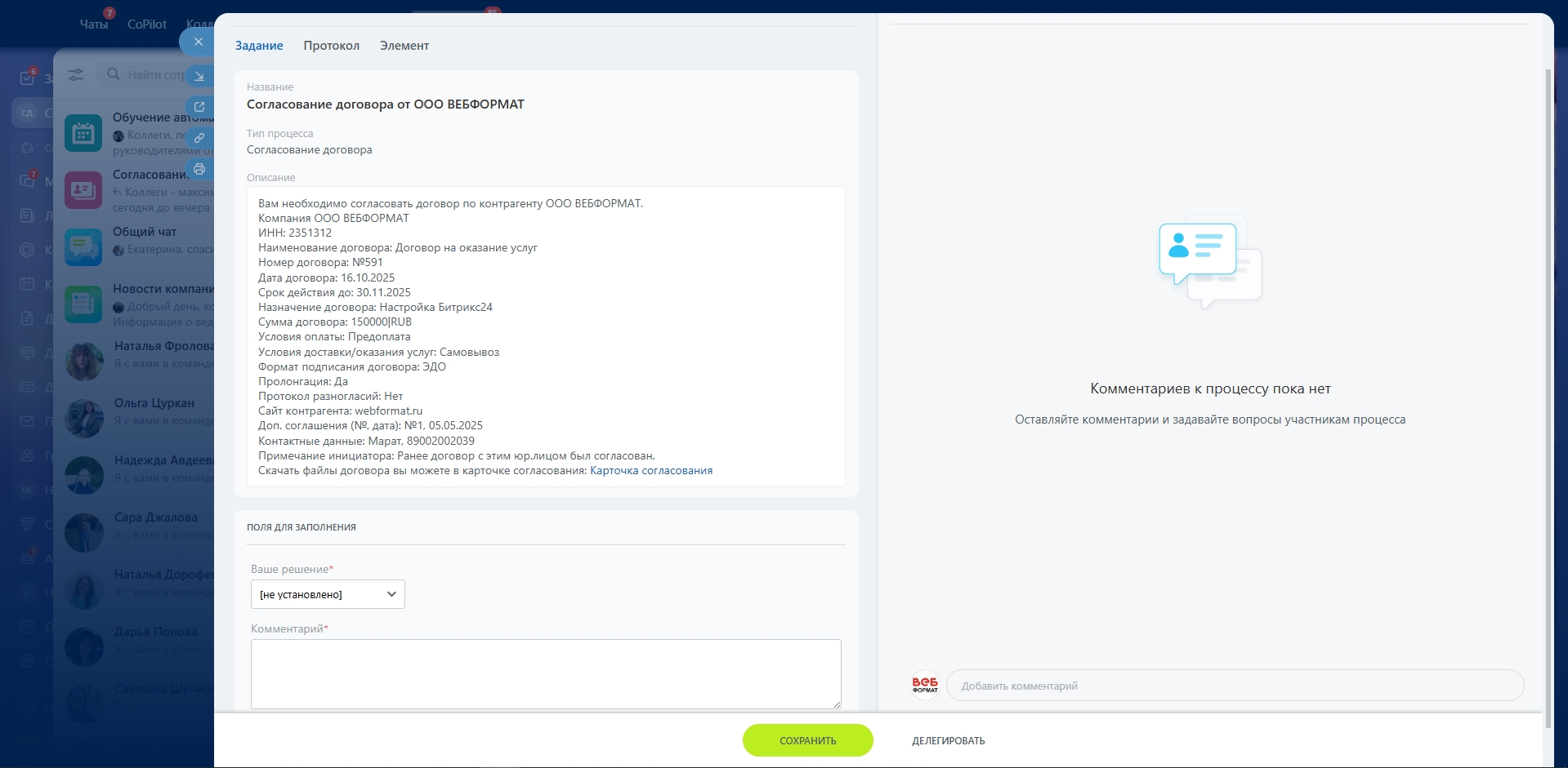 - Единый, управляемый процесс согласования в Битрикс24 вместо разрозненной переписки и файлов.