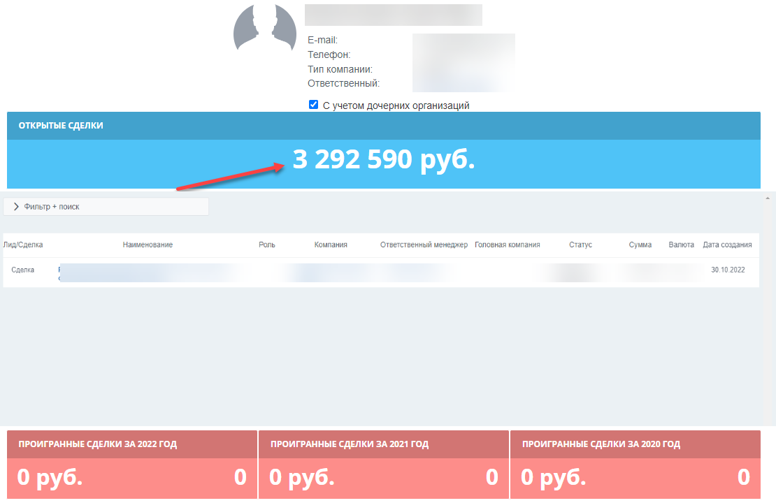 Таким образом, нам была поставлена задача кастомизации портрета клиента: убрать данные о коммуникационной нагрузке и добавить данных по сделкам. Кроме этого, нужно было связать новый портрет клиента с уже существующей доработкой, позволяющей устанавливать связи между компаниями (более подробно в отдельной статье).