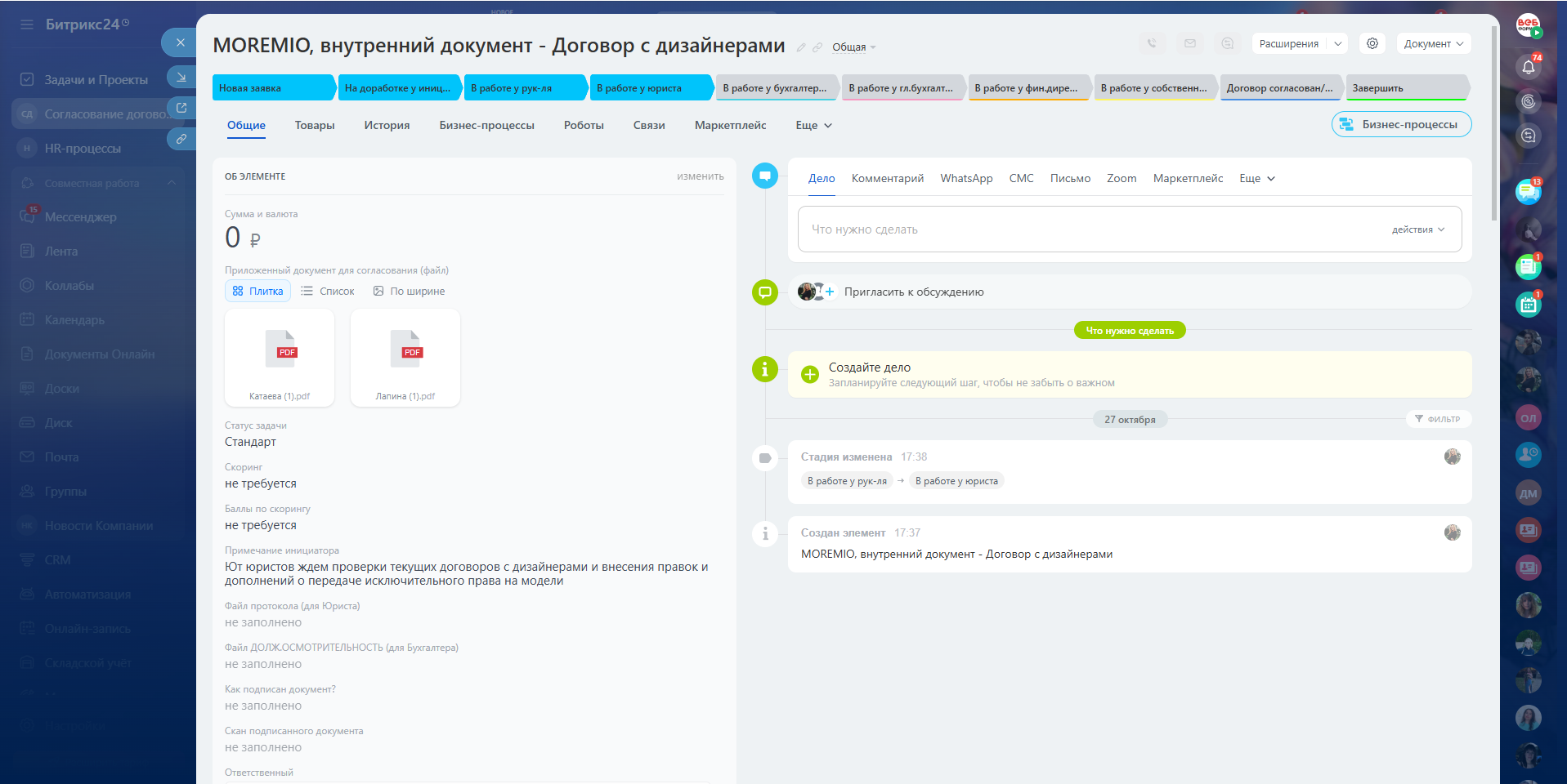 - Таймлайн — отображает все действия и переходы карточки между стадиями, формируя прозрачную историю согласования.